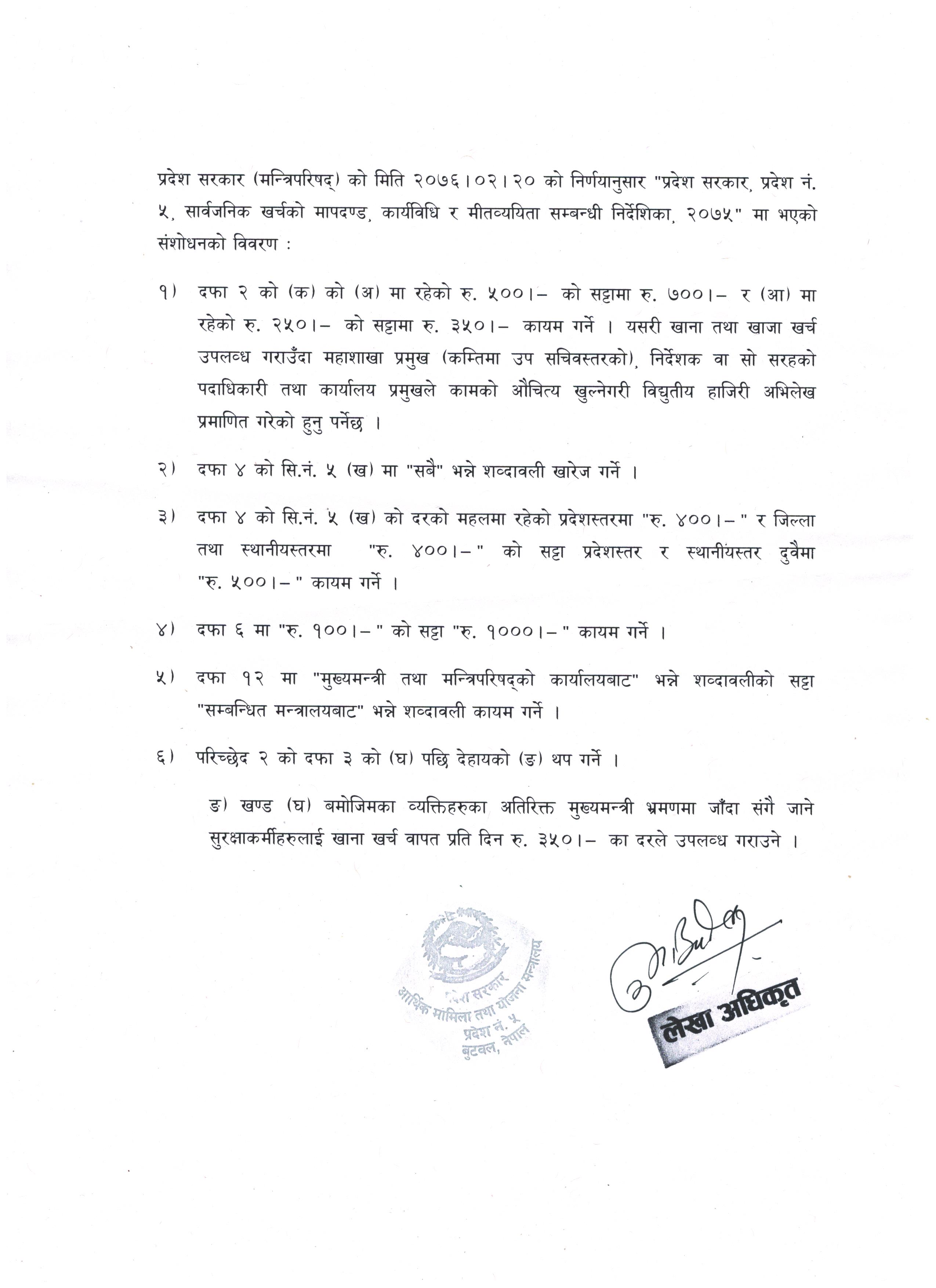 | 3 | सार्वजनिक खर्चको मापदण्ड, कार्यविधि र मितव्ययिता सम्बन्धी निर्देशिका, २०७५ दोस्रो संसोधन | ऐन | 2078-06-12 | View |